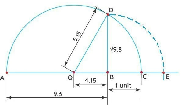 8. Mark the Point: Draw an arc with radius &&BD&& that intersects the number line. Let’s call this intersection point &&E&&. Point &&E&& is the representation of &&\sqrt{9.3}&& on the number line.